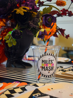 For Miles’ Monster Mash, we styled the table with ghost cake plates, checkered dinner plates, wooden utensils, purple and orange napkins, and clear cups with lids and straws. And because the details matter, every cup got a custom sticker to match the party branding (of course!).